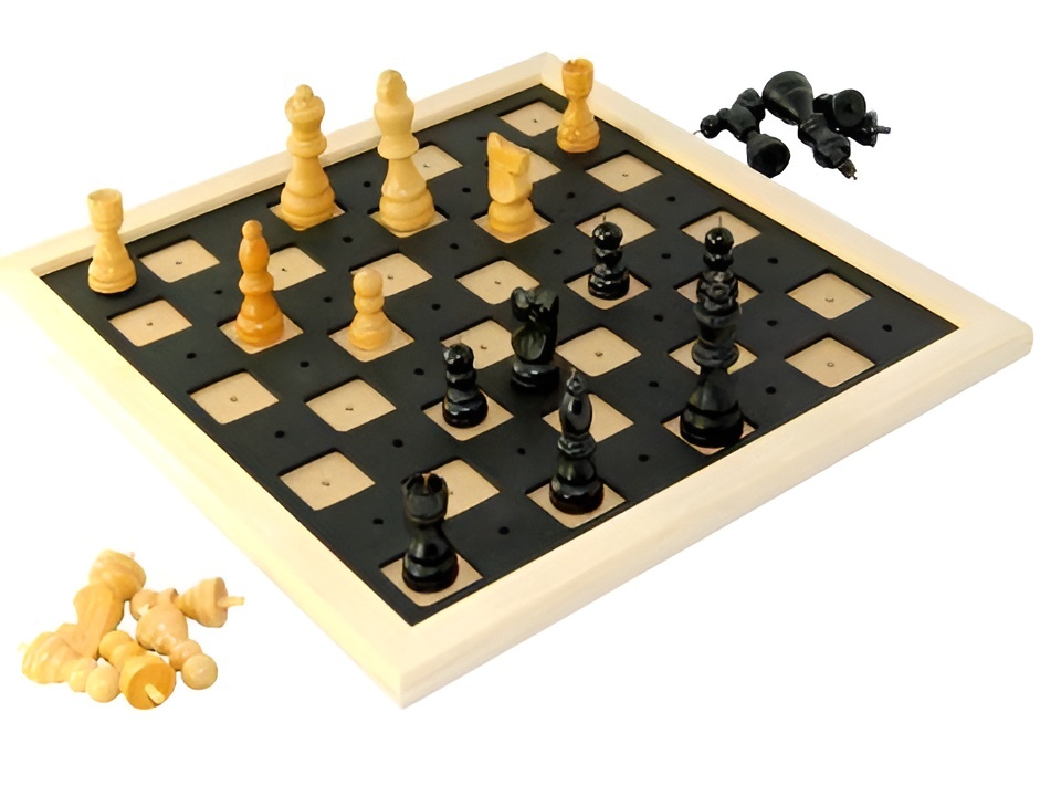 Шахматные фигуры также имеют две особенности: во-первых, в их основаниях находятся ножки для вставки в отверстия на полях шахматной доски; во-вторых, все черные фигуры снабжены металлическими наконечниками. Благодаря этому существенно упрощается процесс игры для людей с нарушенным зрением.