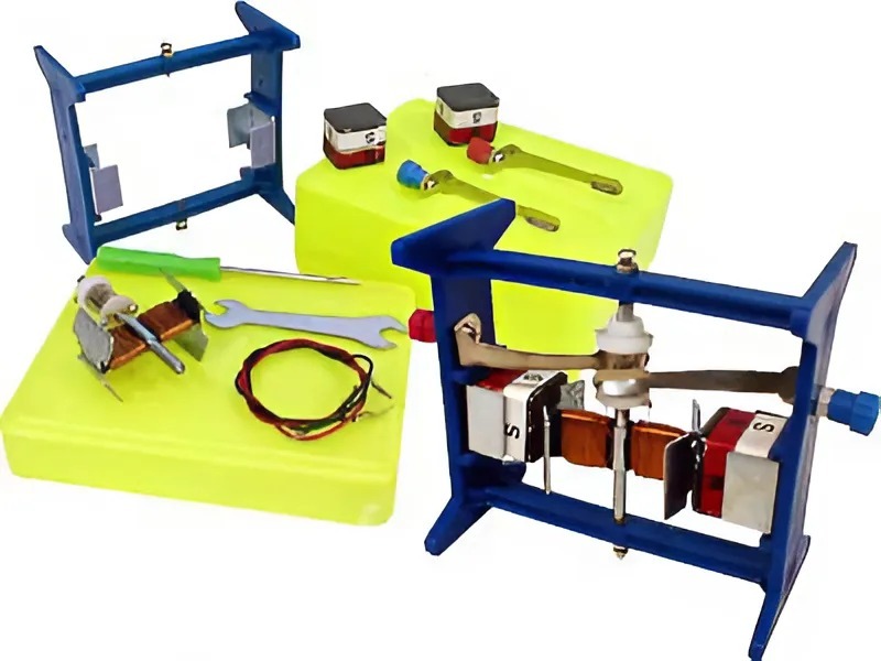Модель предназначена для изучения устройства и действия электродвигателя постоянного тока при проведении лабораторных работ по физике.