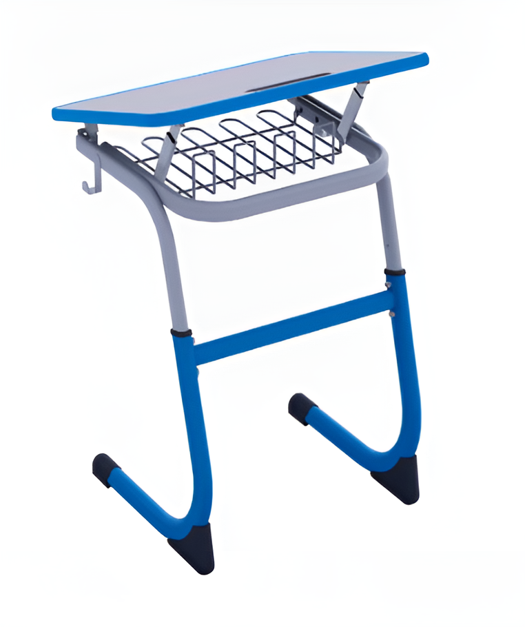 Парта одноместная регулируемая по высоте имеет столешницу ЛДСП с углом наклона с антивандальной полиуретановой кромкой, в столешницу встроен пластиковый пенал, наличие сетки и крючка для рюкзака.