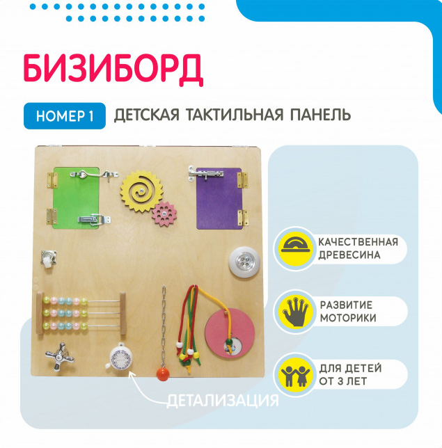 Бизиборд №1 обладает всем необходимым для разностороннего развития ребенка. Удобные дверцы с защелками и шестеренки позволяют развивать мелкую моторику и учить малышей считать. Бусины на шнурках тренируют пальцы и помогают осваивать навыки сопоставления цветов. Все эти элементы не только увлекательны, но и безопасны для малышей благодаря возможности надежного крепления к стене.