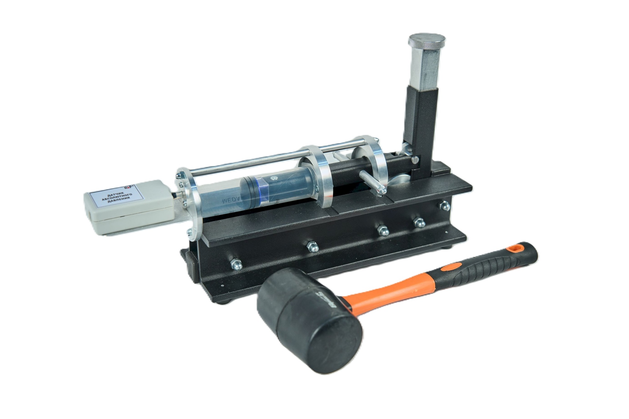 Герметичный резервуар для газа с поршнем смонтирован на массивном основании. Необходимая скорость сжатия газа и, таким образом, адиабатичность процесса обеспечивается при ударе ударным ручным инструментом по клину, который, двигаясь в вертикальном канале, действует на поршень и заставляет его сначала сжимать газ, а затем удерживать газ при минимальном значении объема. Давление газа измеряется датчиком абсолютного давления, который устанавливается вплотную к резервуару и соединяется с ним гибкой трубкой.