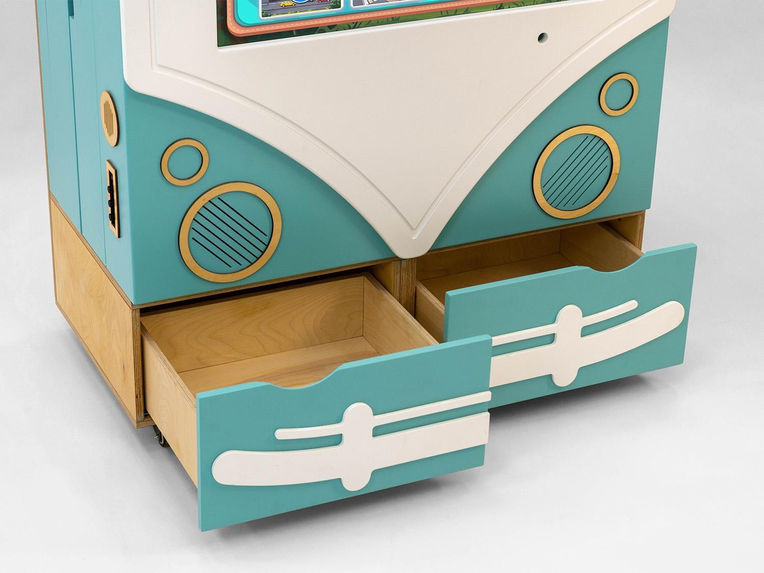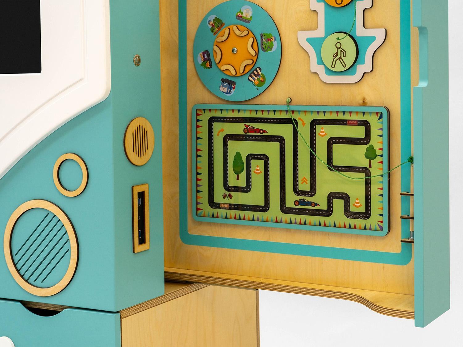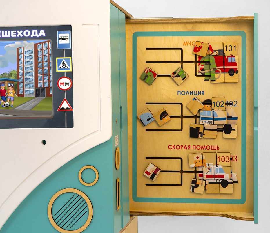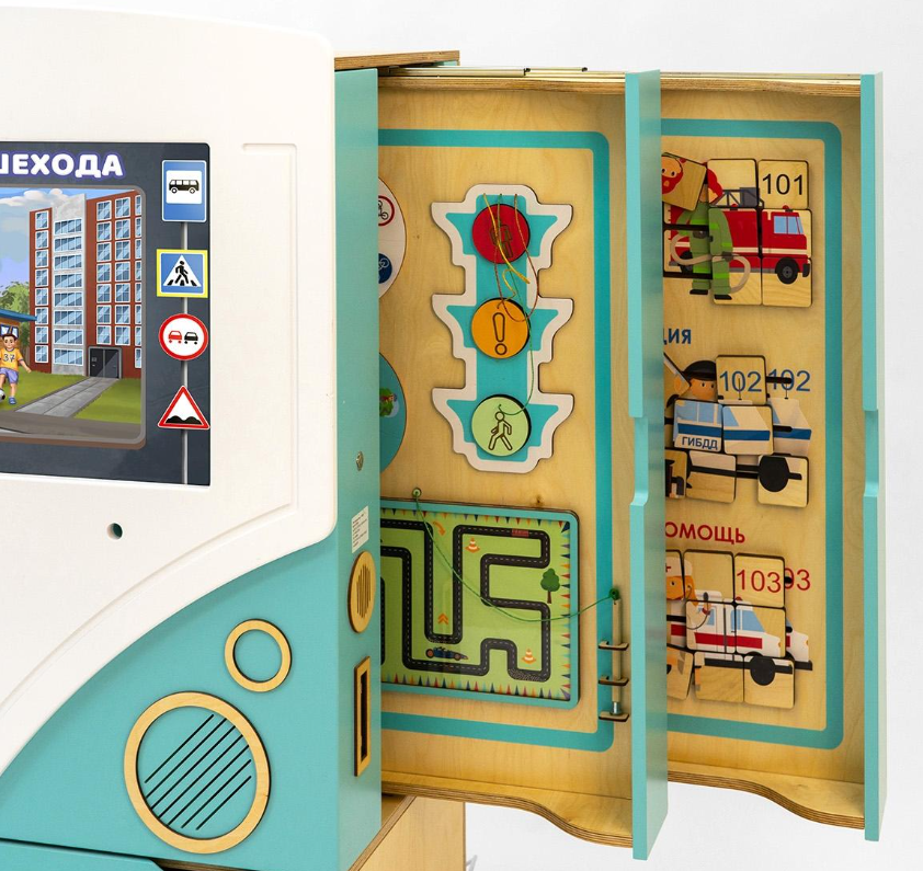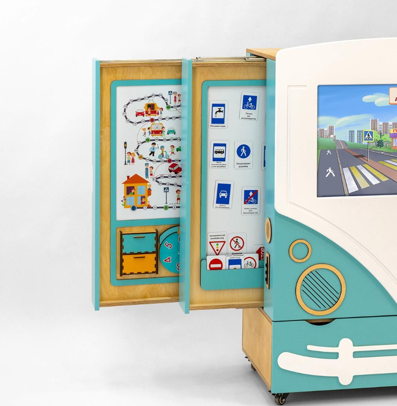В нижней части панели-автобуса предусмотрены два выдвижных ящика для хранения игрушек и методических материалов. Весь интерактивный комплекс имеет колёсики со стопорами, чтобы его легко можно было передвинуть в любое место.