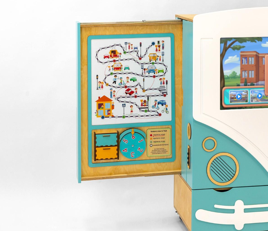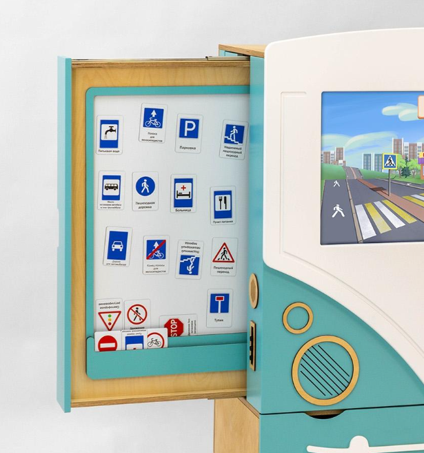 Методический интерактивный комплекс ПДД состоит из передней панели с мультимедийным монитором и четырёх выдвижных модулей по бокам. Выполнен в дизайне «Автобус». Главная тематика — изучение правил дорожного движения.