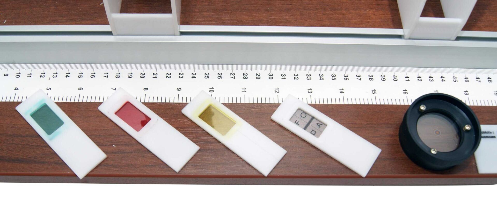 Комплект состоит из установка источника белого света с регулируемым источником питания, сетки, собирательной линзы и экрана с миллиметровой шкалой в виде креста, устанавливаемых в рейтерах на оптической скамье. На боковой поверхности скамьи нанесена миллиметровая шкала. В комплект входит набор, позволяющий изучать