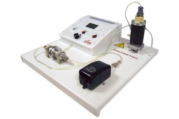 Учебный лабораторный стенд представляет собой металлическую раму, на которую установлена столешница из диэлектрического материала. На столешнице размещен блок управления, регулируемый компрессор (производительность до 6л/мин) и нагреватель. На нагревателе, в специальном пазе, установлена колба, выполненная из алюминиевого сплава.