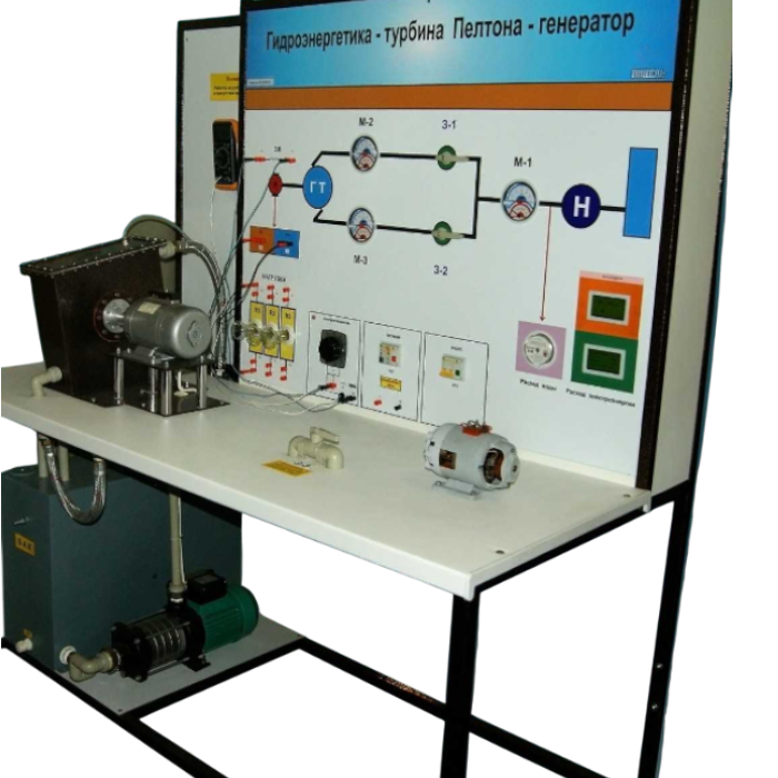 Выполнен в виде настольной конструкции, состоящей из основания, на котором размещены бак водяной, насосный агрегат подачи воды в систему турбина Пелтона-генератор, панели управления и измерения, кальной стойки, выполненной из металла с порошковым покрытием. Модуль создания нагрузки на генератор предусматривает различные схемы соединения нагрузки: параллельное, последовательное и смешанное. На панели управления турбиной установлены приборы, показывающие расход потока воды, поступающий в турбину и напор потока на входе в турбину.